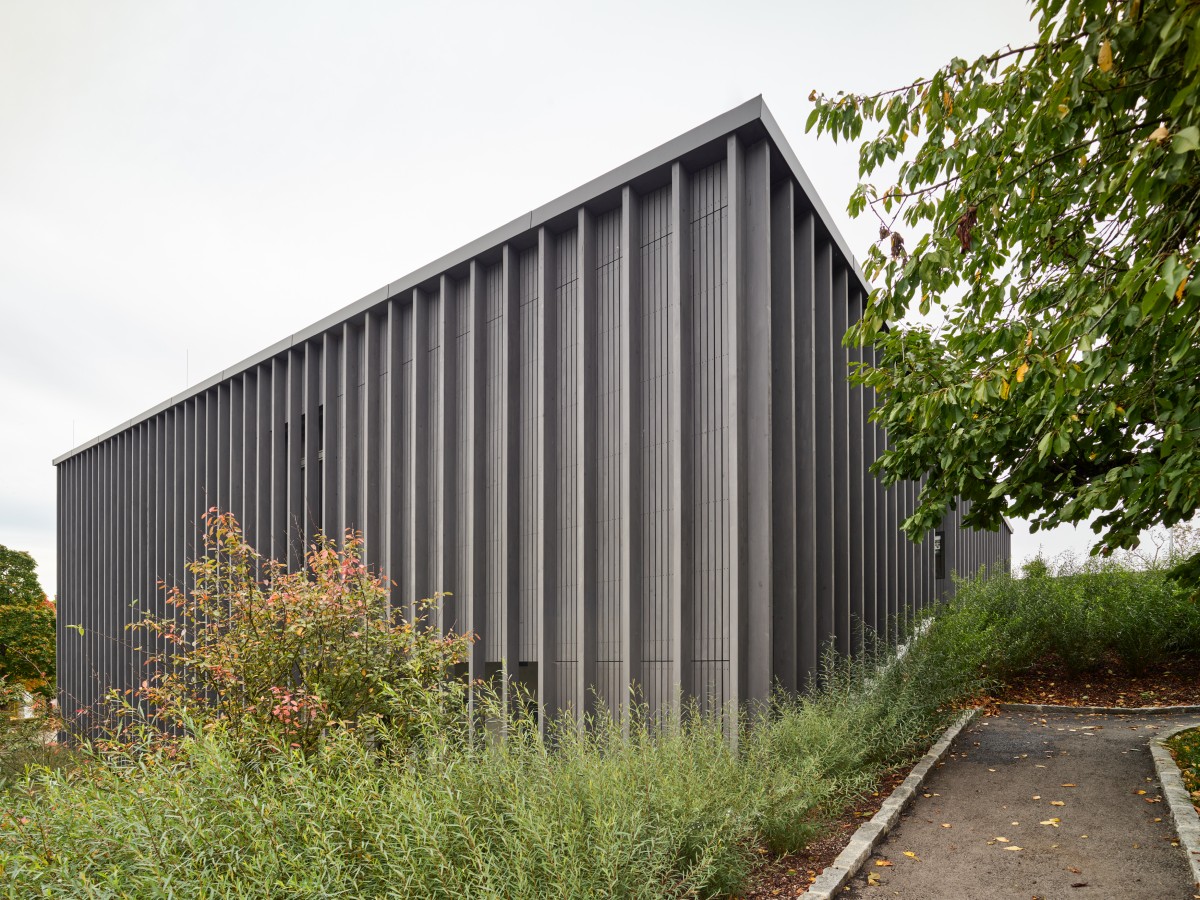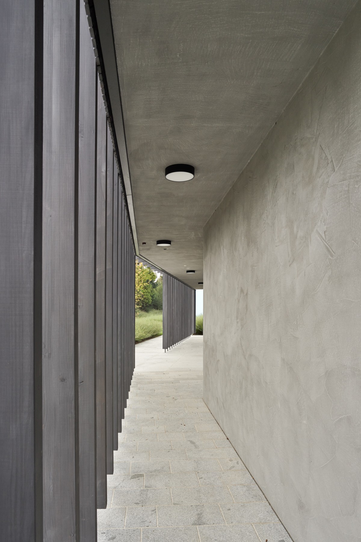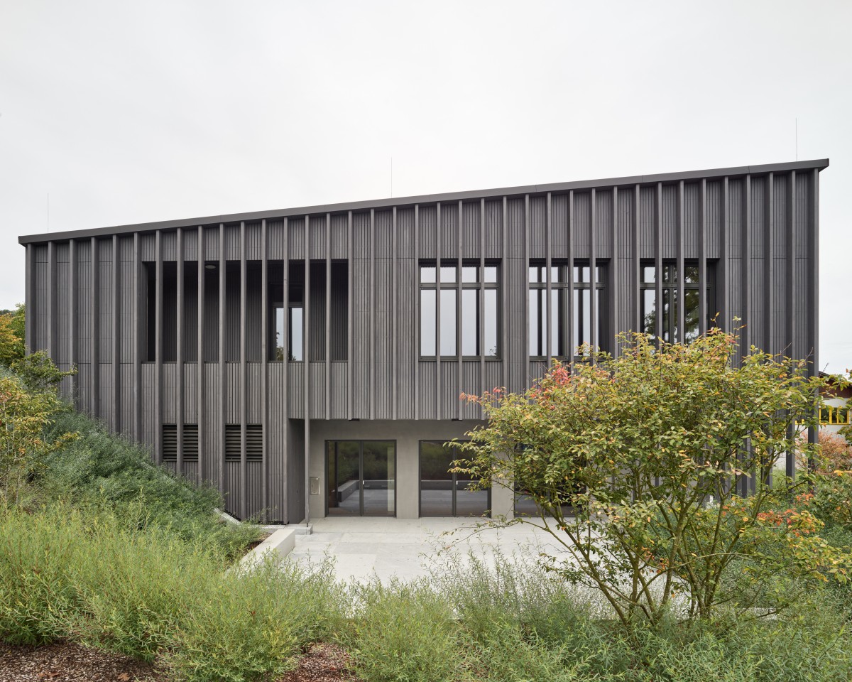 Das Gebäude kombiniert Massivbauweise im Erdgeschoß mit konstruktivem Holzbau im Obergeschoß. Eine Photovoltaikanlage und Wärmepumpe sorgen für energieeffiziente Versorgung. Die grau getönte Fassade mit vertikalen Holzlamellen verlieh dem Haus eine ruhige, markante Präsenz. Innen schaffen Eichenholz und Außen gespachtelte Wandelemente eine warme, handwerklich geprägte Atmosphäre.