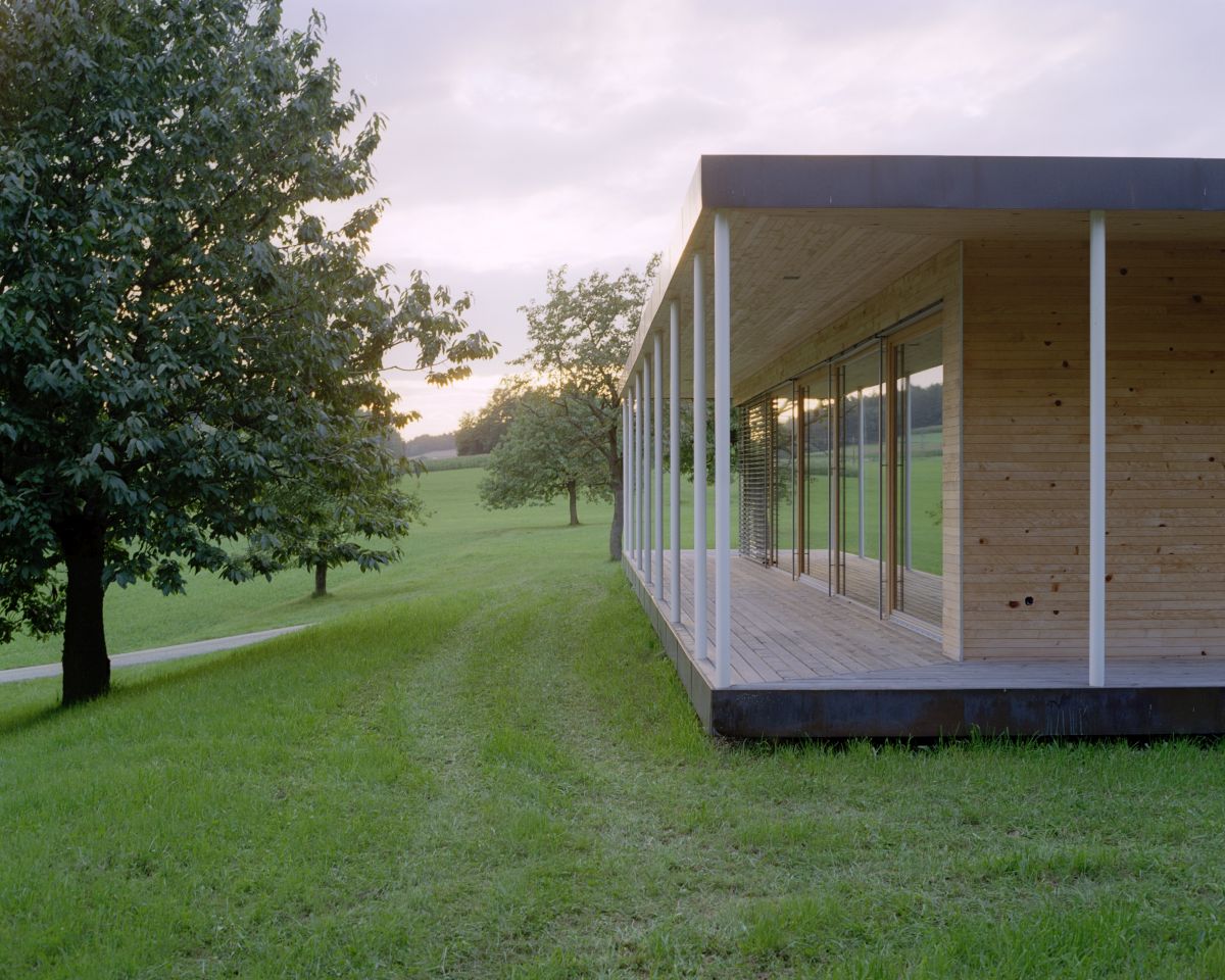In mehrerlei Hinsicht gibt die Natur das Maß für die Dimensionierung des Bungalows vor. Die Gebäudehöhe und die Organisation des Ausblicks orientieren sich exakt an den Bäumen der angrenzenden Streuobstwiese. Ein auskragendes Vordach über der dreiseitigen Terrasse schützt die Holzfassade vor Verwitterung. Die Tiefe der Terrasse variiert je nach Himmelsrichtung bzw. Sonnenstand, ist also Richtung Westen und Osten größer als Richtung Süden und bewahrt vor direkter Sonneneinstrahlung. Die terrassenlose Nordseite ist mit Kupferblech wetterfest verkleidet.
