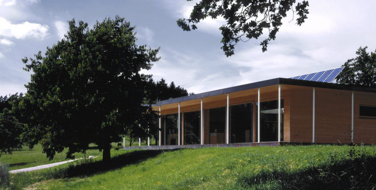 Das Gebäude funktioniert weitgehend energieautark: Das Brauchwasser sammelt sich in einer Regenwasserzisterne, die Warmwasseraufbereitung erfolgt mittels auf dem begrünten Dach montierter Sonnenkollektoren, eine Photovoltaikanlage produziert die nötige Hausenergie. An besonders kalten Tagen kann die aus dem hauseigenen Wald gespeiste Stückgutheizung zugeschaltet werden. Die kontrollierte Wohnraumbelüftung sorgt für optimales Raumklima, dank hervorragender Dämmung erreicht das Gebäude annähernd Passivhausstandard – ohne gestalterische Kompromisse.
