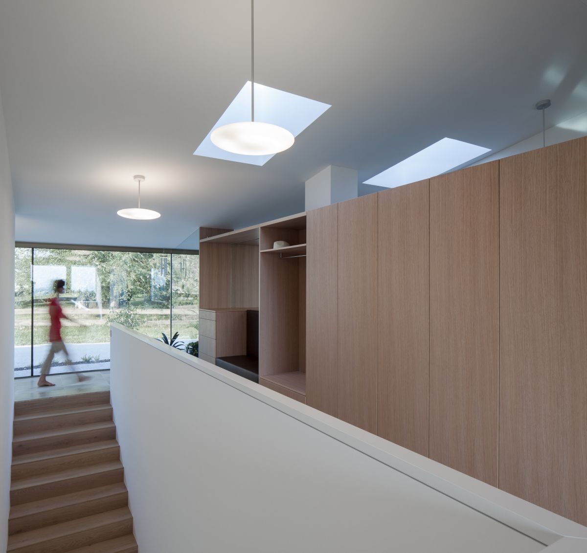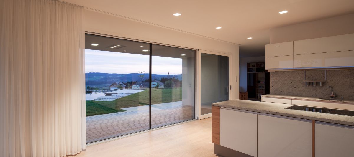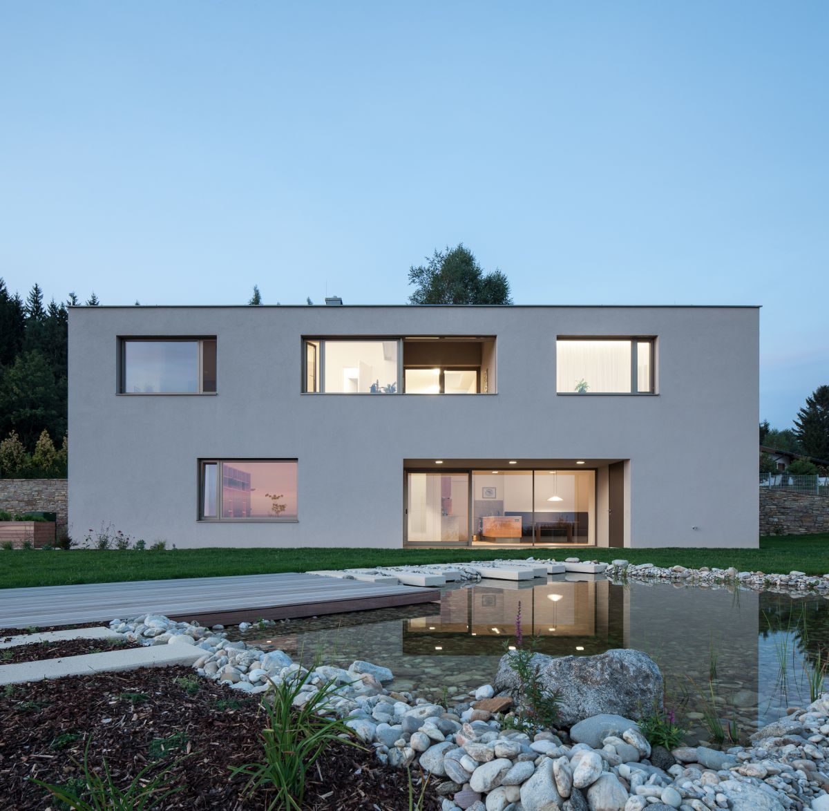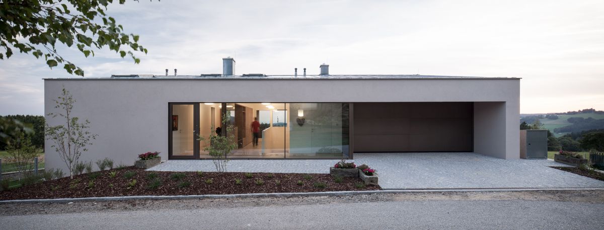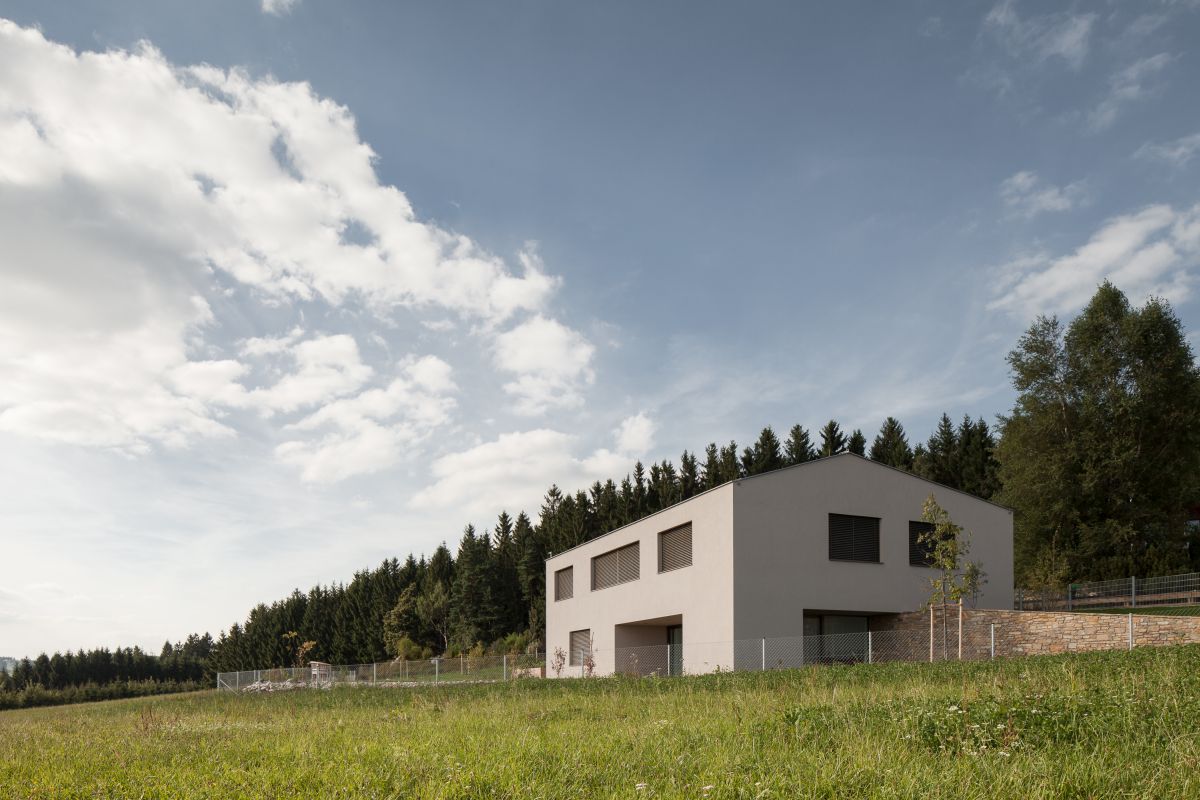 Auf einem nach Süden geneigten Hanggrundstück beherbergt der einfach geschnittene Baukörper im Untergeschoß die Wohnräume, im Obergeschoß Schlafzimmer und Arbeitsräume des Bauherrn. Das Untergeschoß öffnet sich nach Osten zur Morgensonne hin sowie Richtung Süden, hin zu einem Garten samt Schwimmteich. Das in der Gegend übliche Satteldach kommt ohne Vorsprung aus und verstärkt die karge, ja schroffe Wirkung des Massivbaus. Den Kontrapunkt setzen die rhythmisch geschnittenen Öffnungen auf der Südseite.