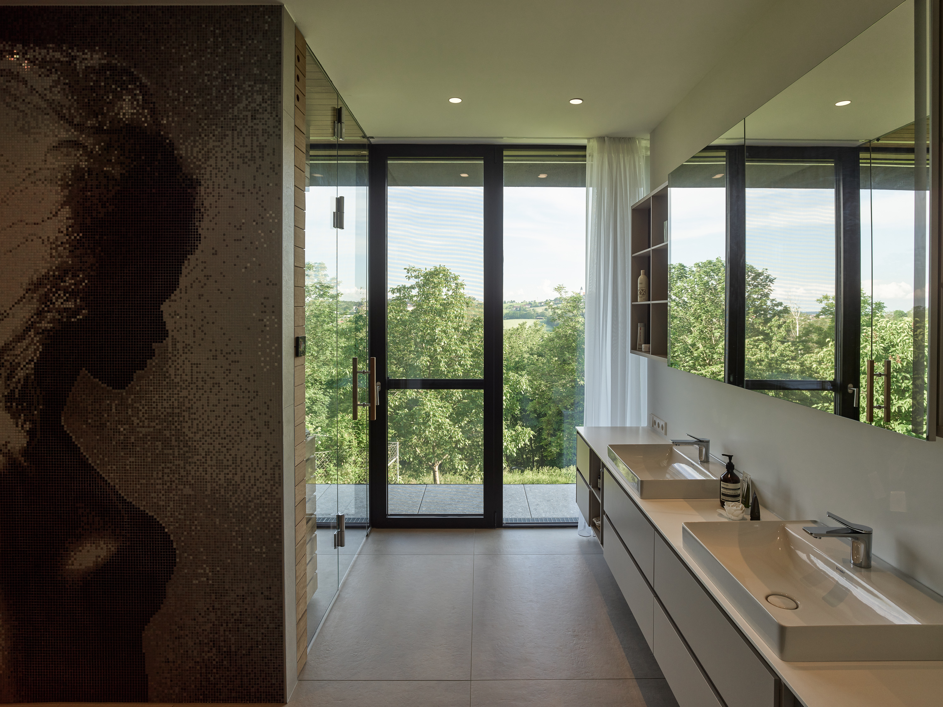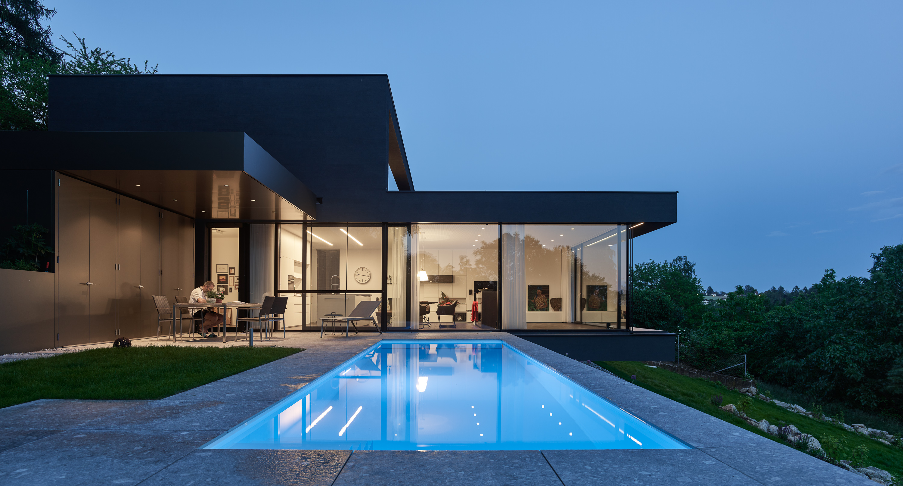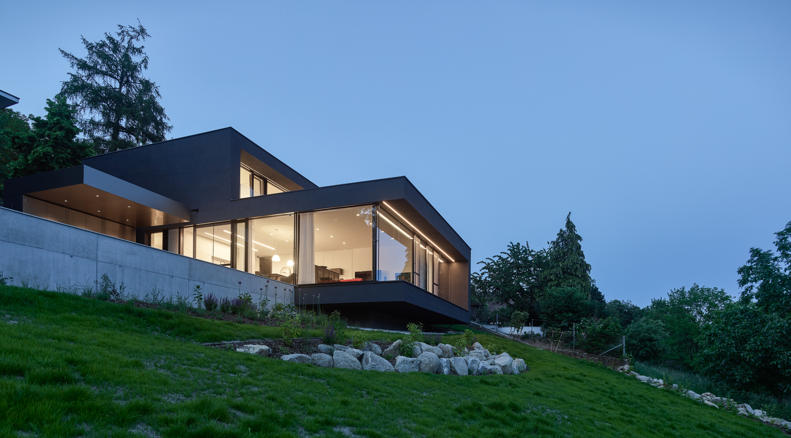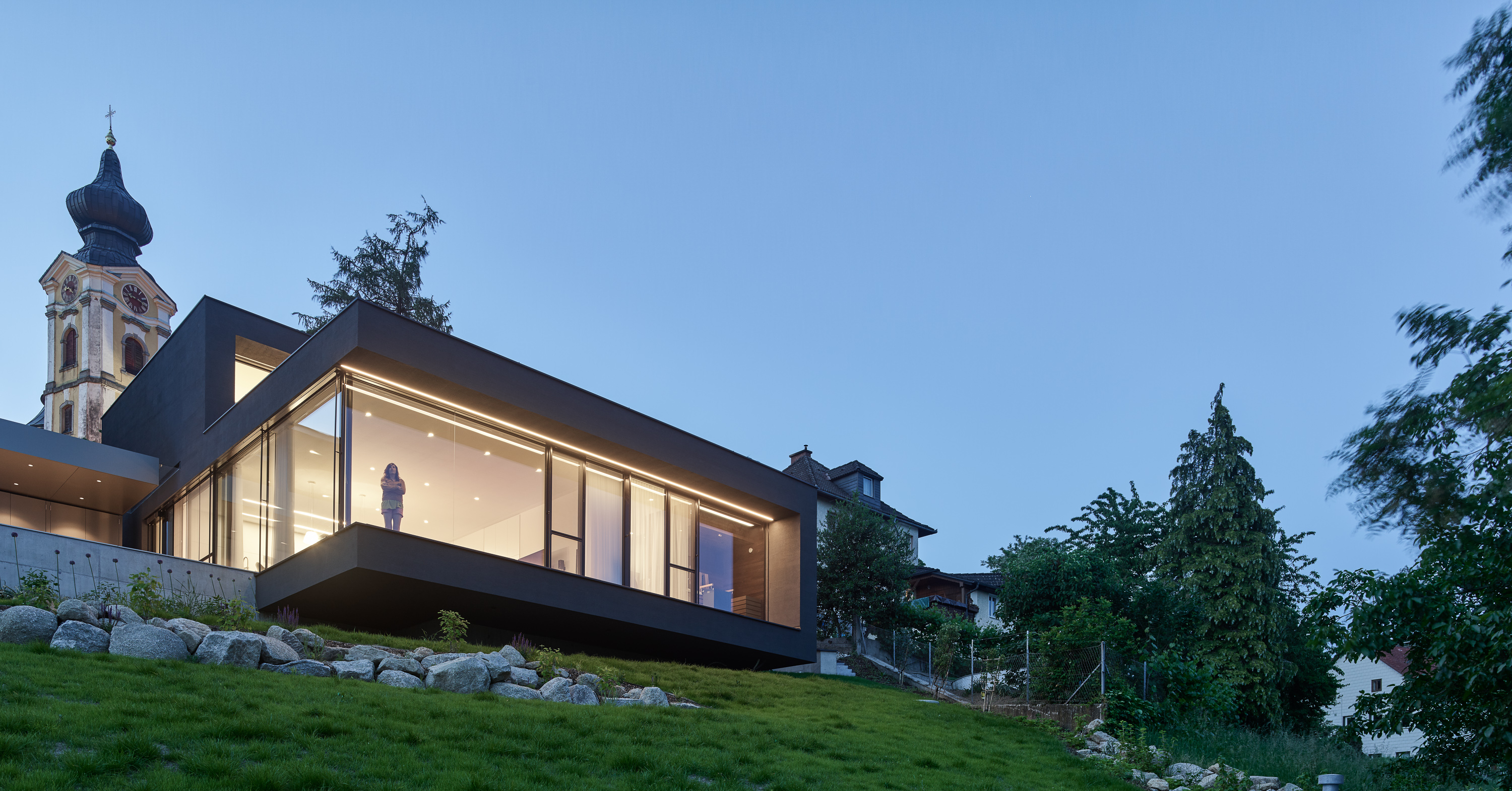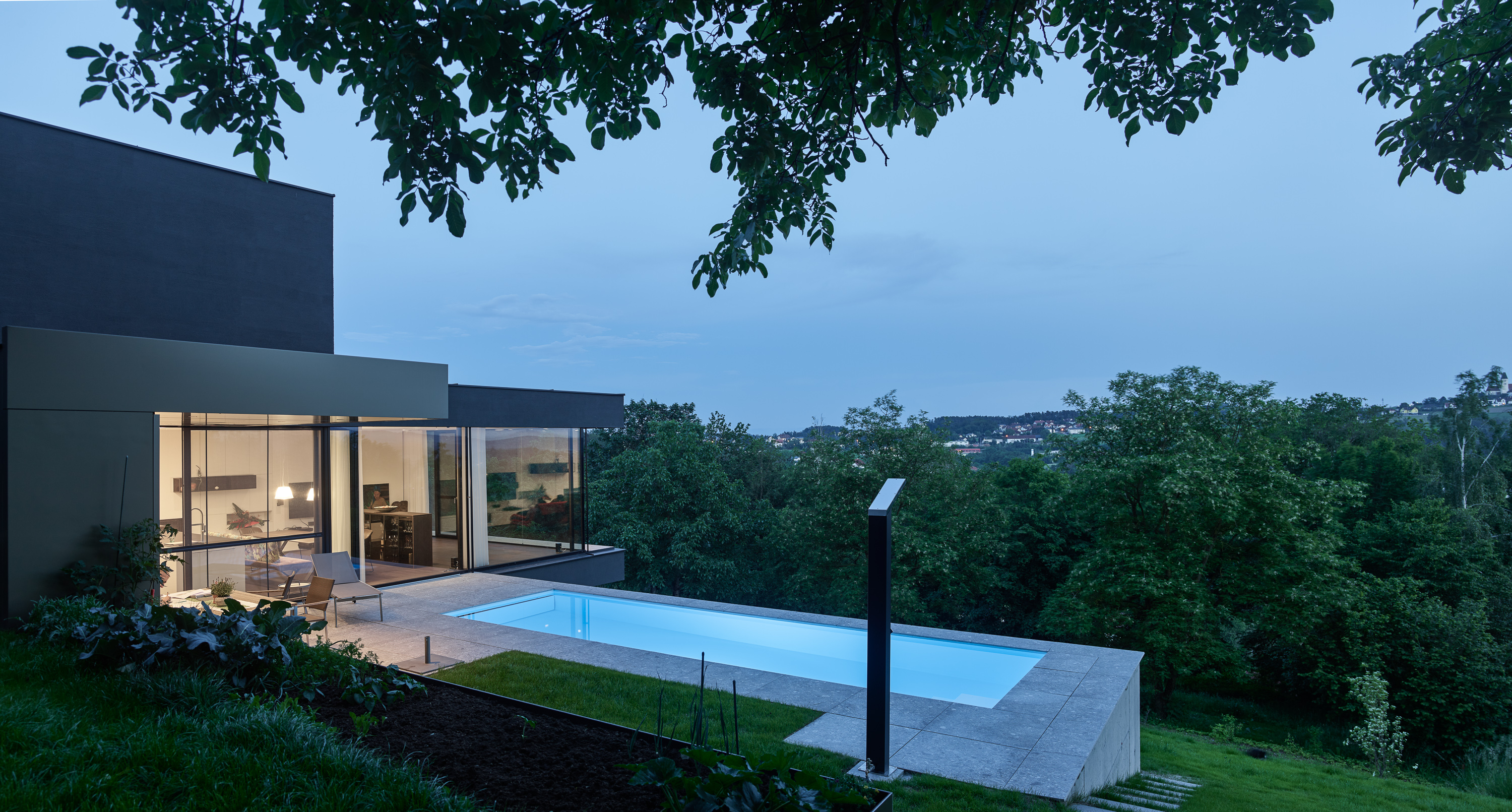 Das Wohnhaus besetzt ein steil abfallendes, Richtung Südwesten orientiertes Grundstück. Die dem Hang gleichsam einkomponierte Entwicklung des Gebäudes und sein dunkler Verputz zollen der Topografie, dem benachbarten Umfeld und den gewohnten Blickbeziehungen vor Ort Respekt. Großzügige Fensterflächen öffnen das Wohnhaus zur reizvollen Landschaft des unteren Mühlviertels und sorgen für einen Wohnzimmerblick Richtung Alpen. Ein winkelförmiger Anbau an den Gebäudekern schafft einen überdachte Verweilzone im Freien, der ein Pool vorgelagert ist. Das Haus ist nicht unterkellert, weshalb im Untergeschoß neben der lichtdurchfluteten Wohnzone auch Haustechnik- und Lagerräume organisiert sind. Erschlossen wird das Haus über das Obergeschoß, in dem sich straßenseitig Eingang und Garage, nach Südwesten hin ein Gästewohnbereich befinden.