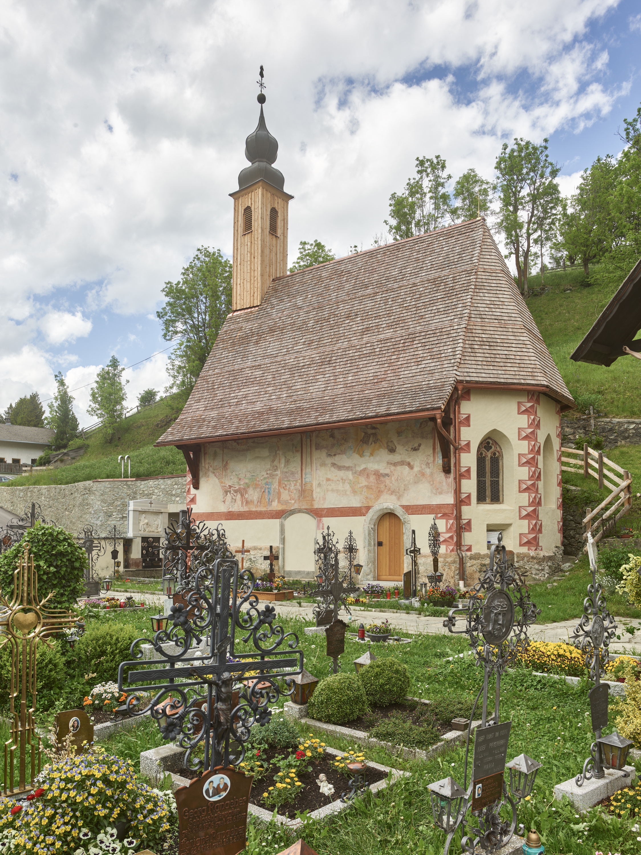 Zufahrt, Vorplatz und der Friedhof der Pfarrkirche wurden durch den Bau hoher Stützmauern als Terrassen in das steile Gelände gebaut.