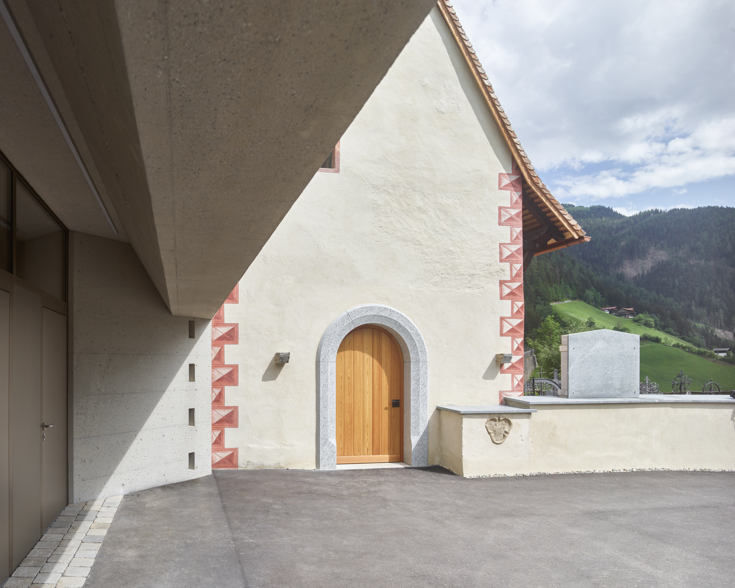 Die wichtigste Maßnahme bei der Neugestaltung des Kirchenareals in Sagritz war der Rückbau der westseitigen Friedhofmauer zwischen Vorplatz und dem Zugang zur Pfarrkirche. Damit entsteht eine gute Sichtverbindung zum Haupteingang der Pfarrkirche und im Zugangsbereich ein großer Vorplatz für kirchliche Feste. Der Neubau des Nebengebäudes mit Sanitär und Technikraum wurde in den nordseitigen Hang eingeplant. Die bestehende Natursteinmauer wurde bis zum Nebengebäude verlängert. Ein STB Bau mit auskragender Dachkonstruktion schützt die Zugänge zu den Sanitärräumen vor direkter Bewitterung. Durch die Portalkonstruktion mit Oberlichtverglasung werden die Räume belichtete und belüftet. Der Neubau wurde überschüttet und begrünt.